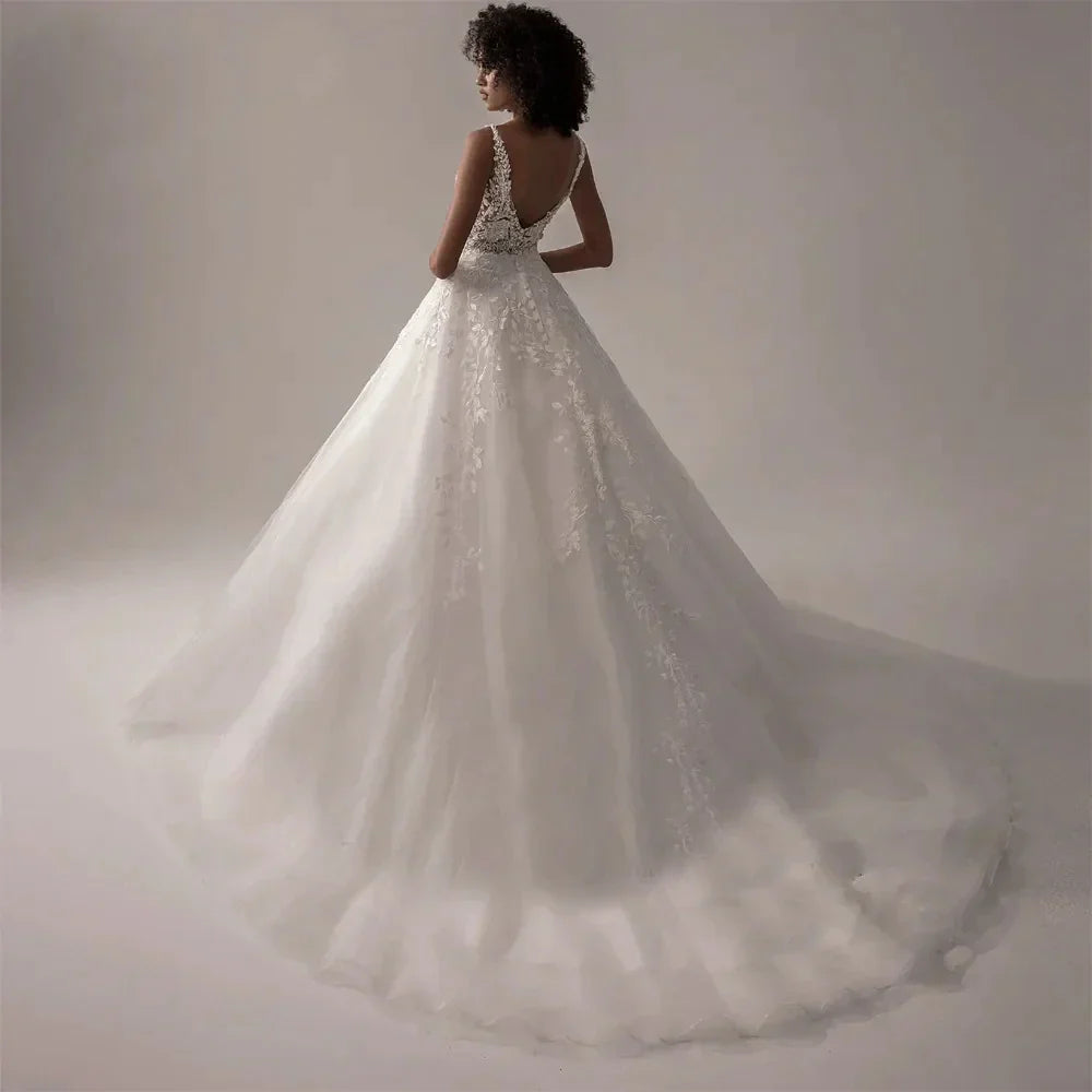 Boho Lace Appliques Wedding Dresses A Line Fuffy Tulle Ball Gowns Sleeveless V Neck Formal Bride Beach Party Vestido De Novia