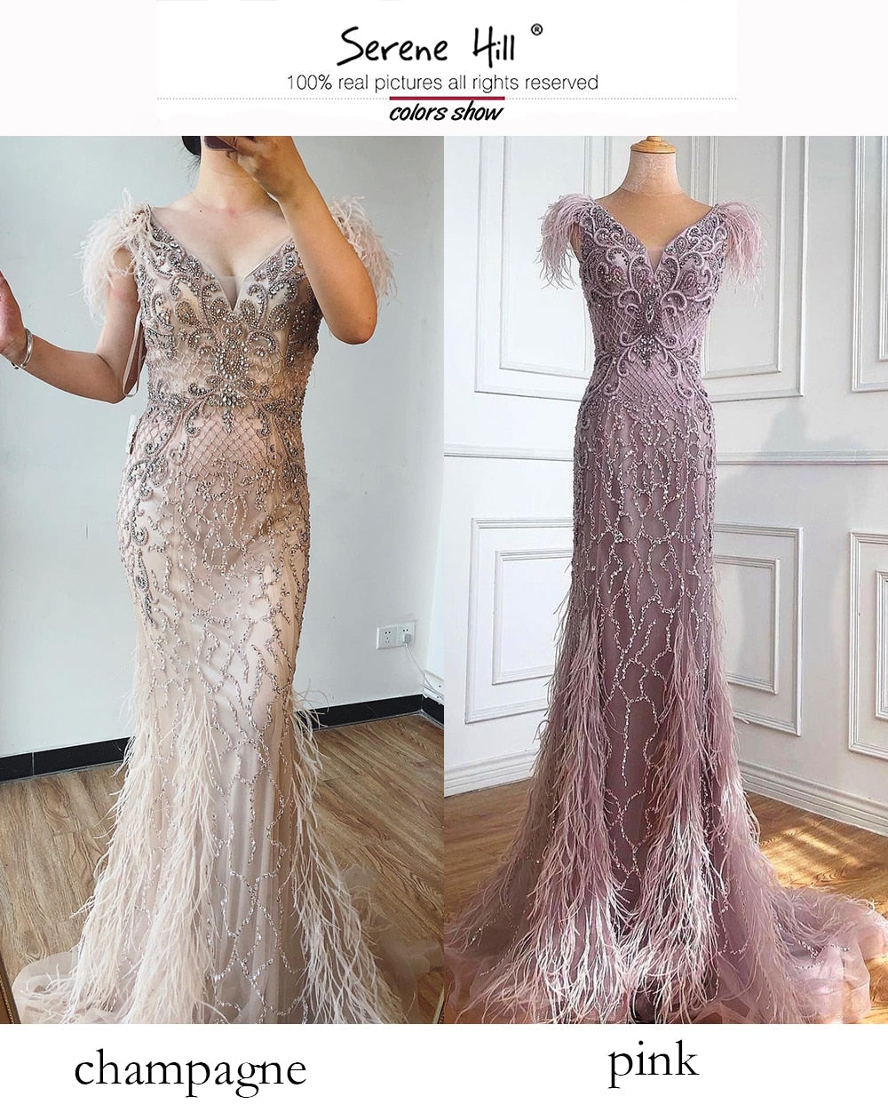Champagne Luxury V-Neck Sexy Mermaid Evening Dresses 2025 Diamond Feathers Sleeveless Formal Dress LA70350