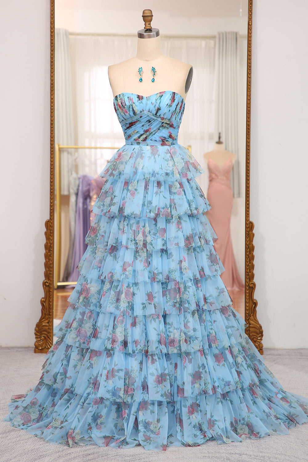 Charming A Line Off the Shoulder Blue Printed Long Prom Dress with Ruffles