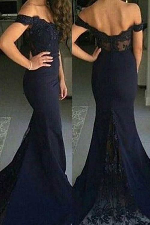 Charming Navy Off shoulder Lace Court Train Mermaid Bridesmaid Dress