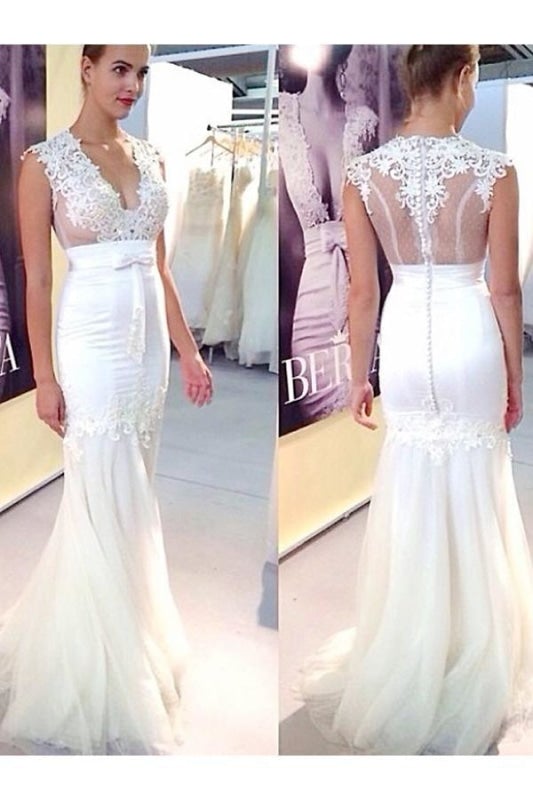 Chic Applique Tulle V-neck Sleeveless Mermaid Elegant Wedding Dresses