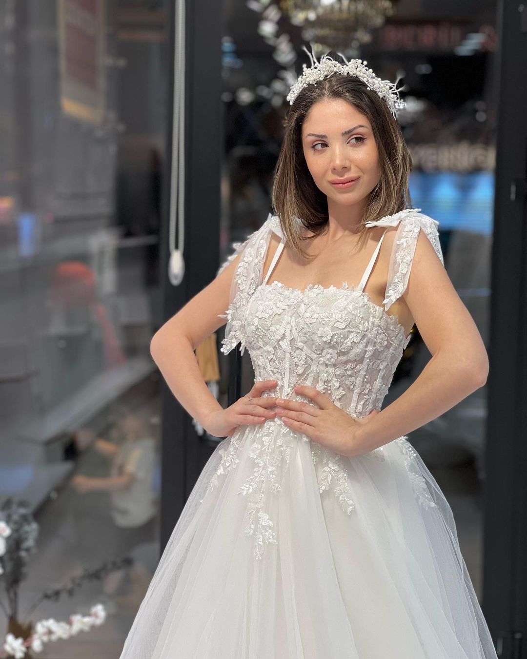 This chic a-line wedding dress features a floor-length silhouette. sweetheart neckline. and delicate tulle with appliques. The sleeveless design is elegant and timeless. perfect for your special day.