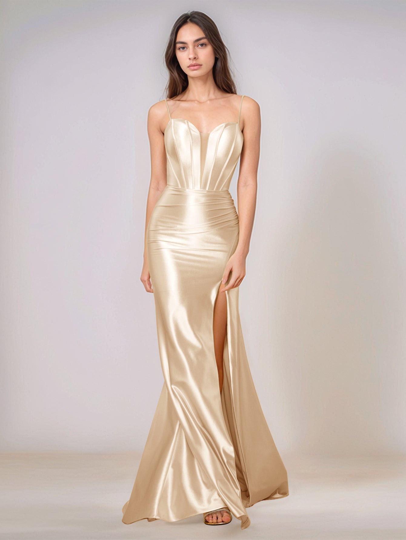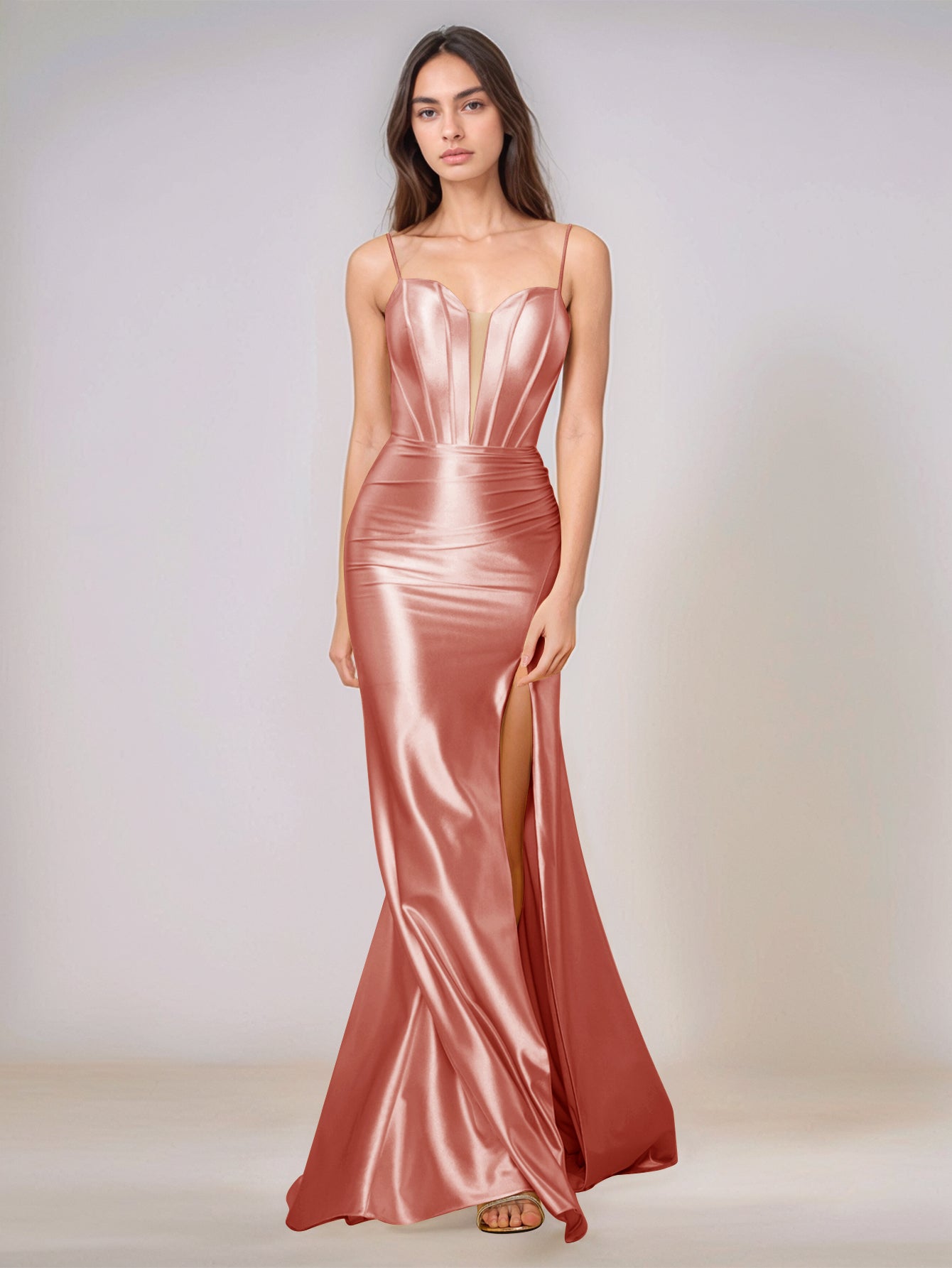Deep V-neck Spaghetti Straps Mermaid Bridesmaid Dress Long with Slit