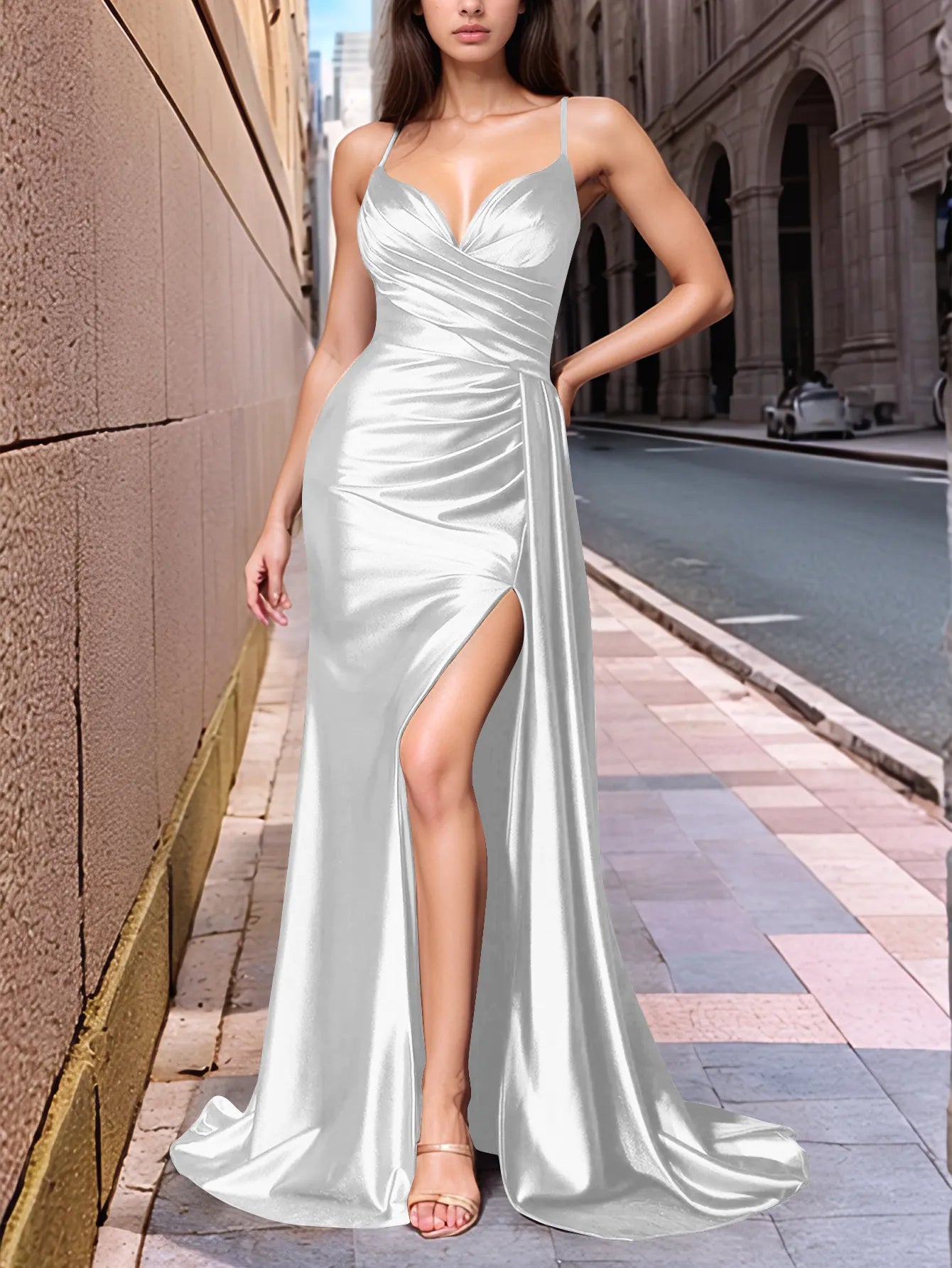 Draped V-neck Satin Prom Dress with Slit