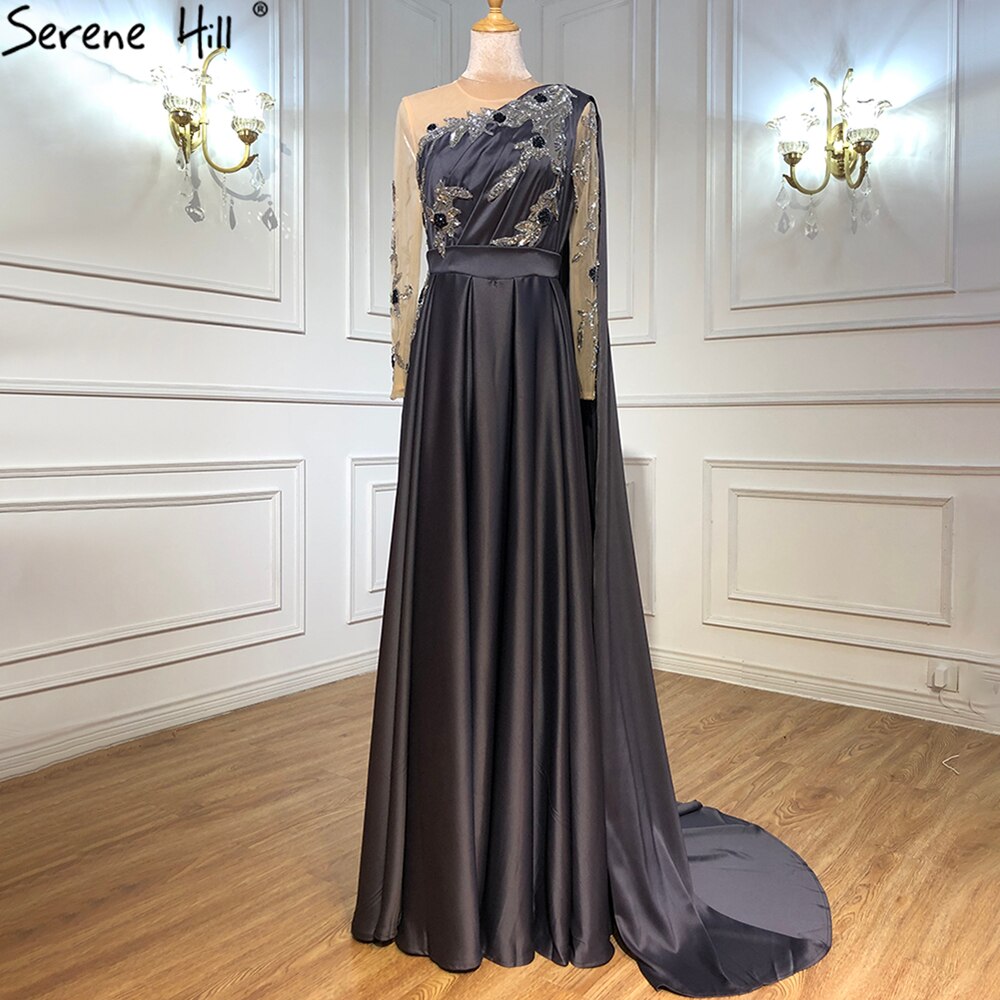 Dubai Blue O-Neck Beading Sexy Evening Dresses Design 2025 A-Line Satin Long Sleeves Formal Dress LA70505