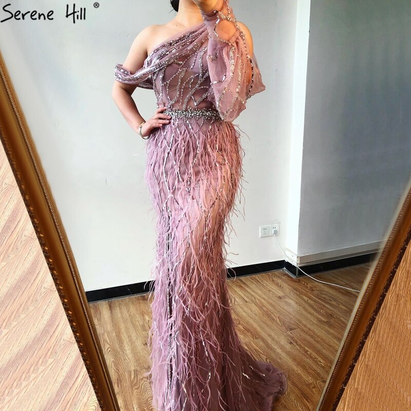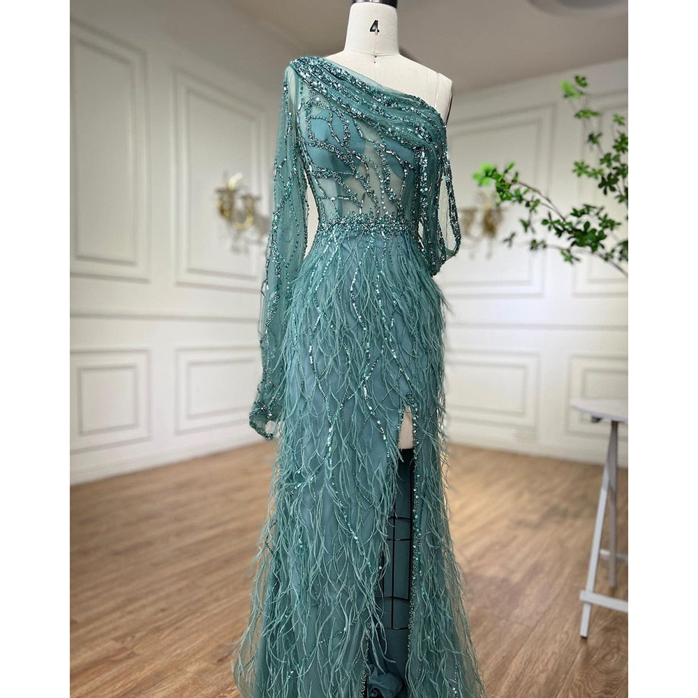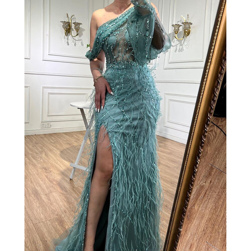 Dubai Eine Shouder Wein Roten Abendkleid Kleider Feder Split Perlen Luxus Meerjungfrau Formale Kleid 2025 LA70513
