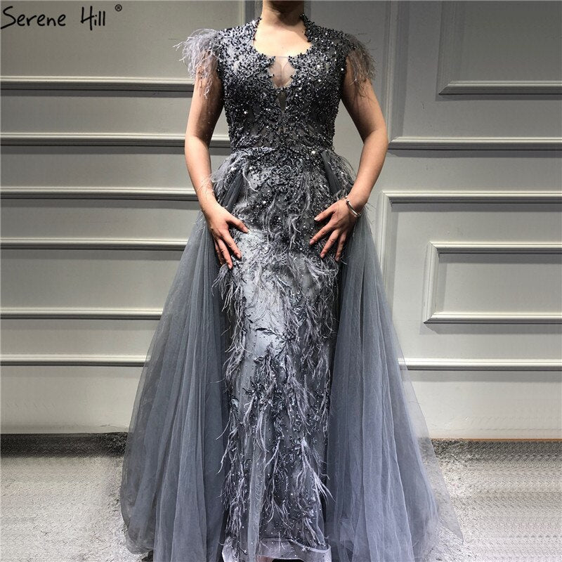 Dubai Grey Sleeveless Tulle Evening Dresses Design 2025 Crystal Feathers Luxury Formal Dress LA70020