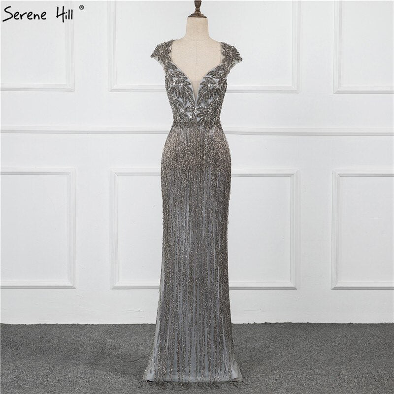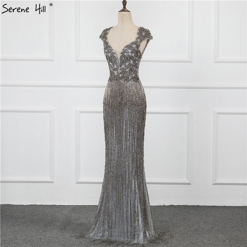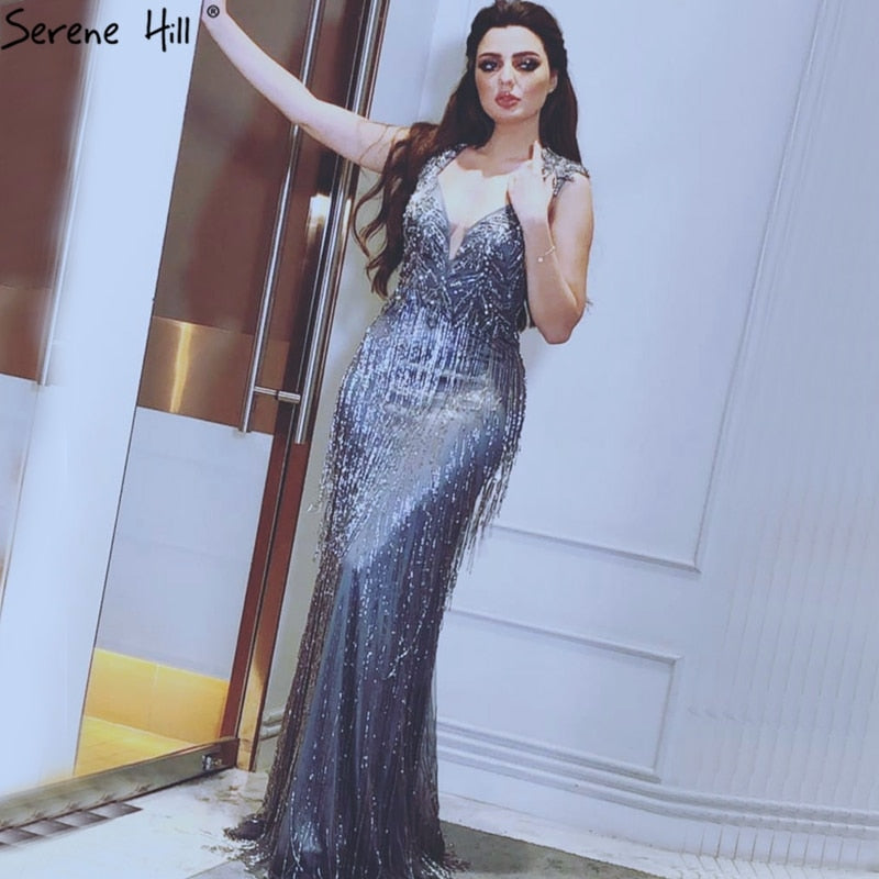 Dubai Luxury V-Neck Silver Sexy Evening Dresses 2025 Long Sleeves Beading Tassel Formal Dress LA70061