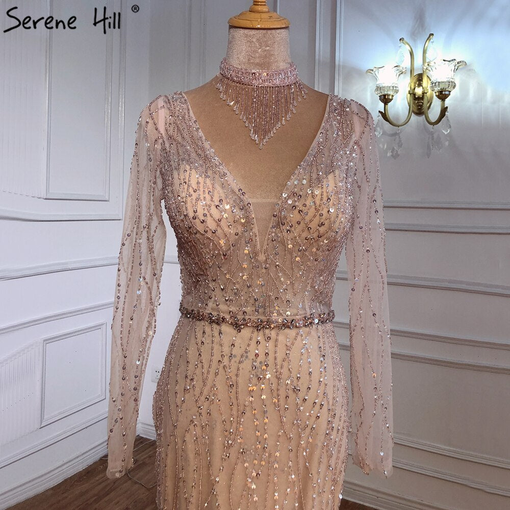 Dubai Mermaid Pink Beading Sequins Evening Dresses V-Neck Long Sleeves Luxury Formal Dress 2025 LA70526