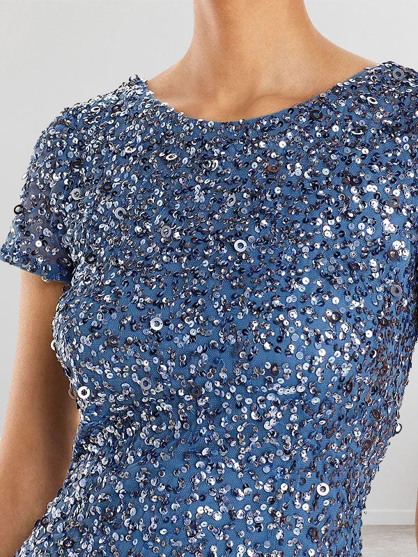 Dusty Blue Sequins Sheath Scoop Long Mother of the Bride Dress