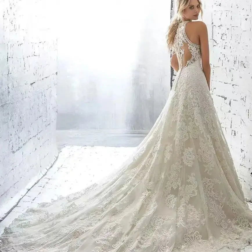 Elegant Beige Gown with Halter Lace A-LINE Sleeveless Cut-out Sweep Train Floor-Length Evening Gown for Women vestidos de novia