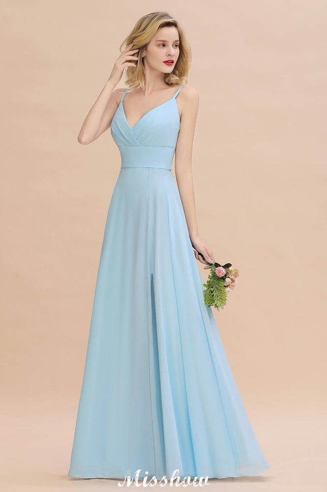 Elegant Front Split Bridesmaid Dress Garden Spaghetti Straps V-neck Floor Length Dress