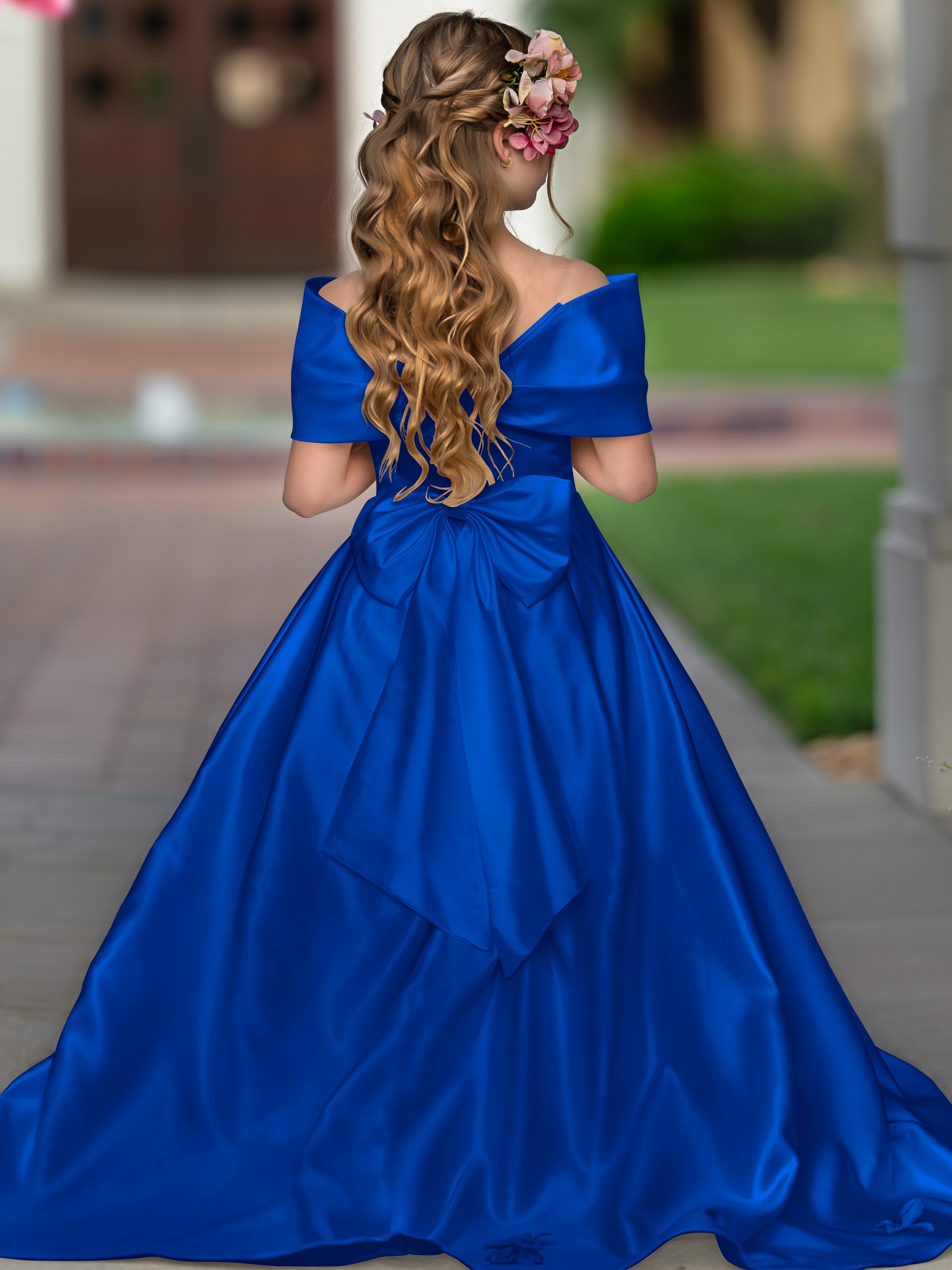 Elegant Ivory Satin Princess Ball Gown with Sweep Train and Bow for Flower Girls