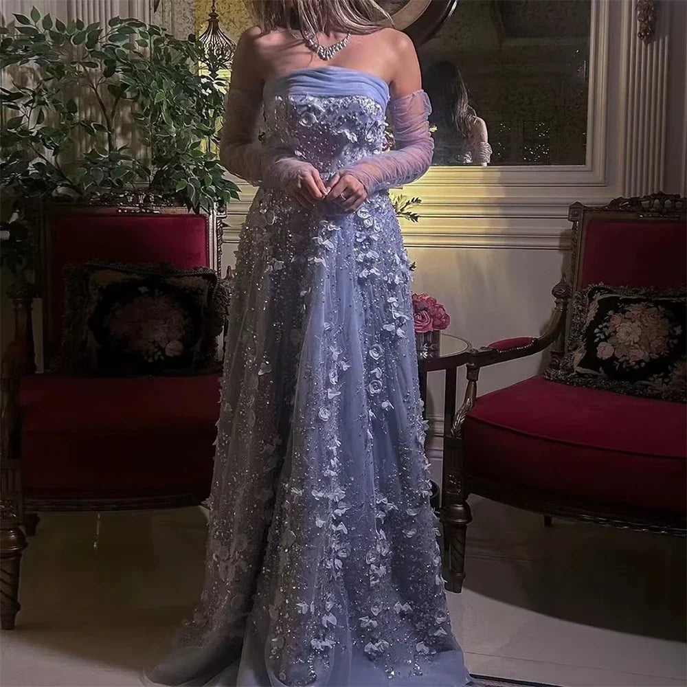 Elegant Peach 3D Flowers Evening Dress with Gloves Arabic Women Wedding Party LA72912