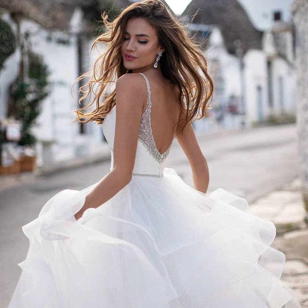 Elegant Spaghetti Straps Ball Gown Wedding Dresses Backless Robe de Mariage Delicate Beaded Ruffles Bridal Gown