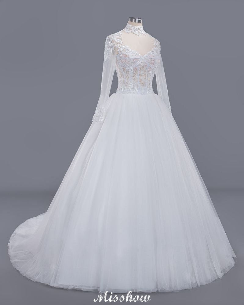 Elegant Tulle Lace Ball Gown High Neck Long Sleeves Floor Length Wedding Dress