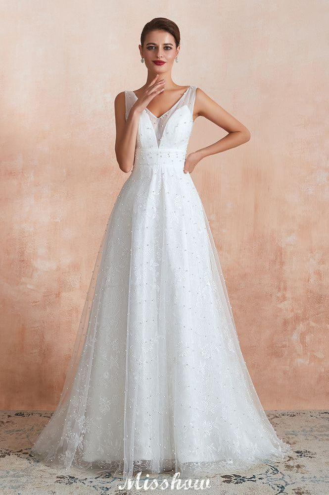 Elegant V-Neck Tulle Pearls Wedding Dress Beach Bridal Gown