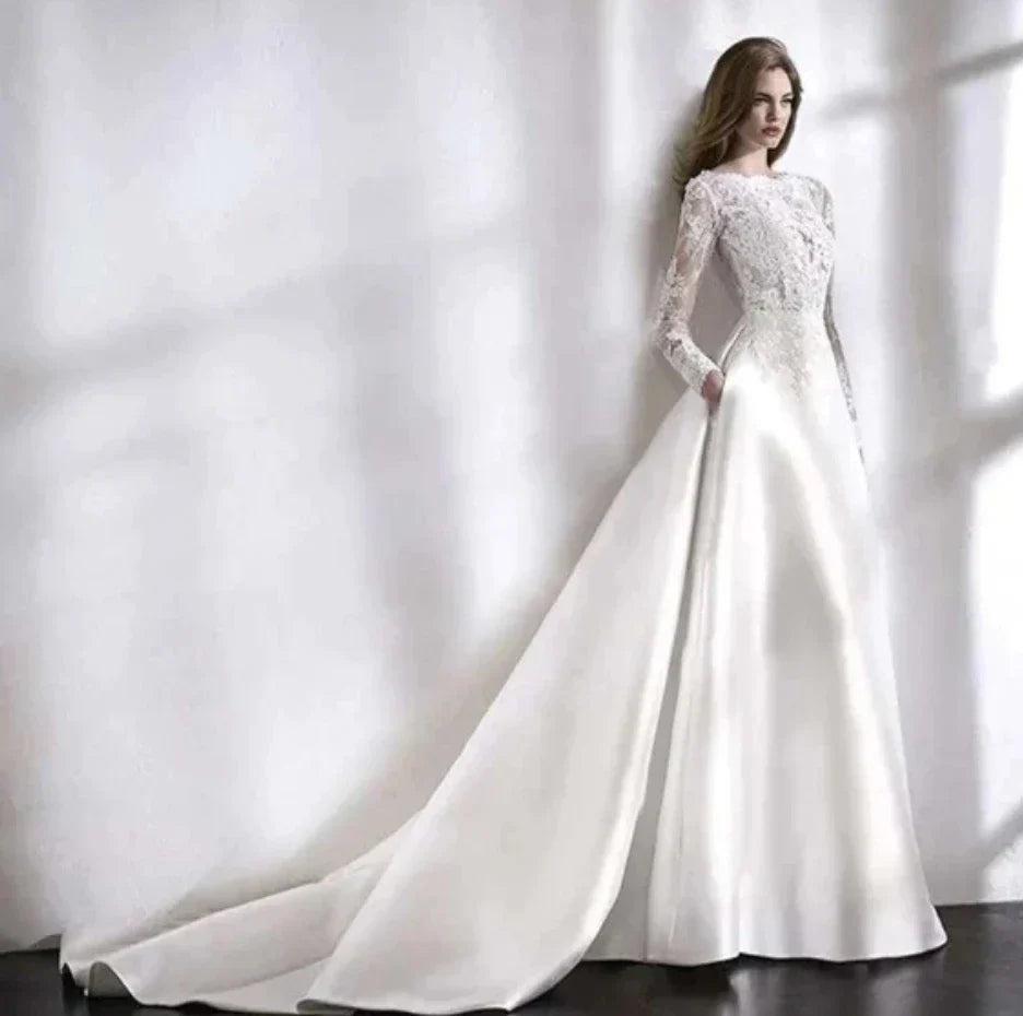 Elegant White Wedding Dress Italian Vintage Backless Applique Lace Long Sleeve Pocket Floor-Length Bridal Gown Vestidos De Novia