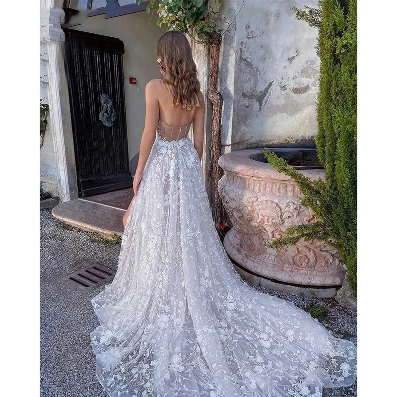 Gorgeous Sexy Off Shoulder Sleeveless High Fork Mopping Wedding Dresses With Split Beach Lace Bride Dresses Backless Custom Made