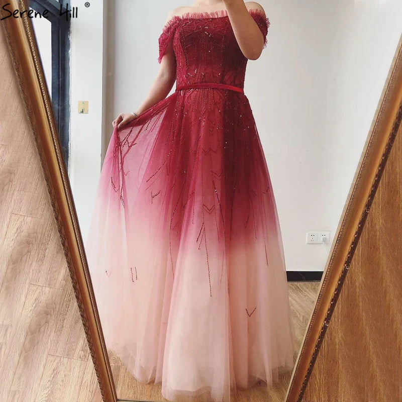 Gradual Change Red A-Line Sexy Evening Dresses 2025 Beading Sequins Boat Neck Formal Dress Design LA70516