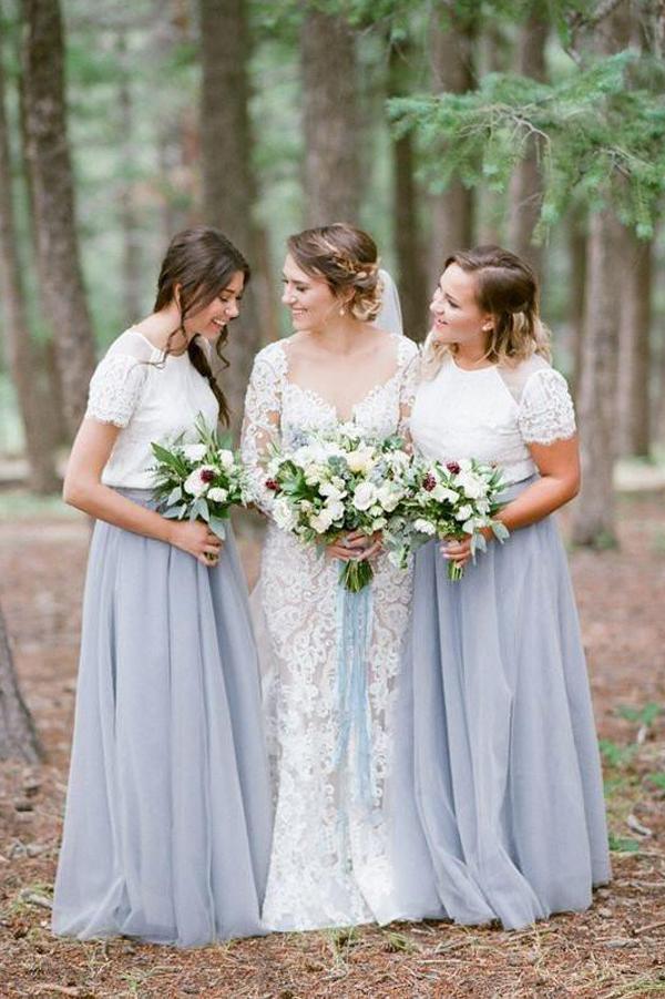Light Grey Tulle Skirt White Top Short Sleeve Long Bridesmaid Dresses