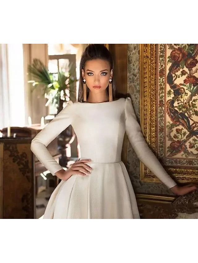 Long A-Line Bateau Neck Court Train Polyester Backless Wedding Dresses with Sleeves