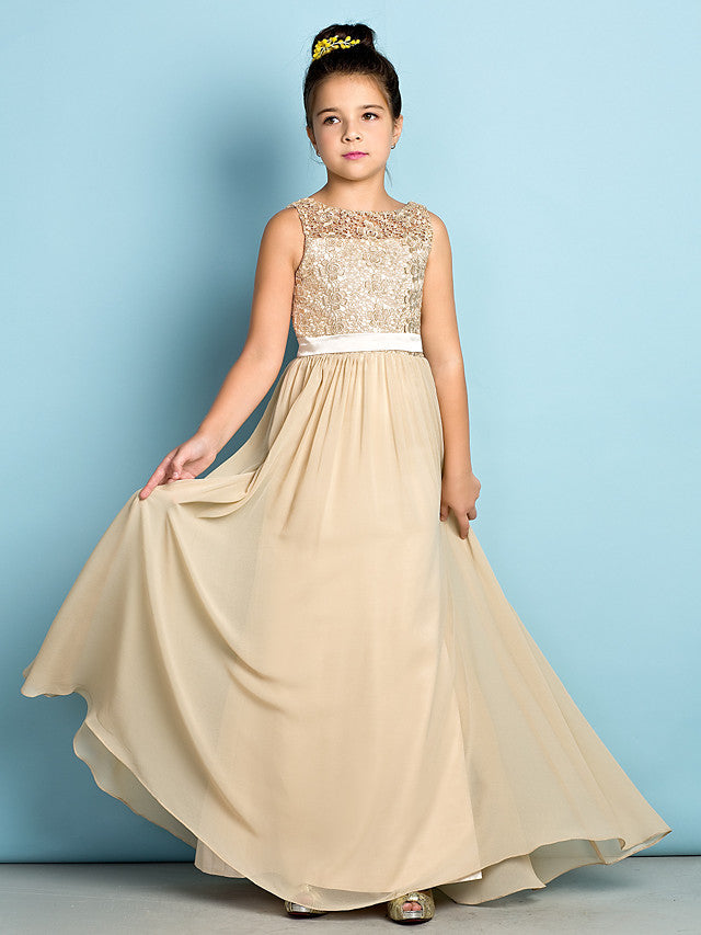 Long A-Line Scoop Neck Flower Girl Dresses Chiffon Lace Junior Bridesmaid Dress