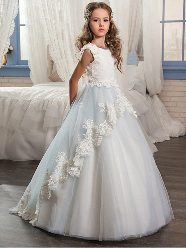Long Ball Gown Jewel Neck Wedding Event Party Flower Girl Dresses With Lace Appliques