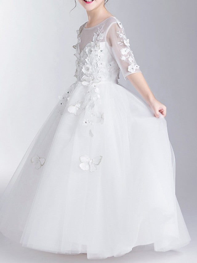 Long Ball Gown Polyester Jewel Neck First Communion Flower Girl Dresses with Sleeves