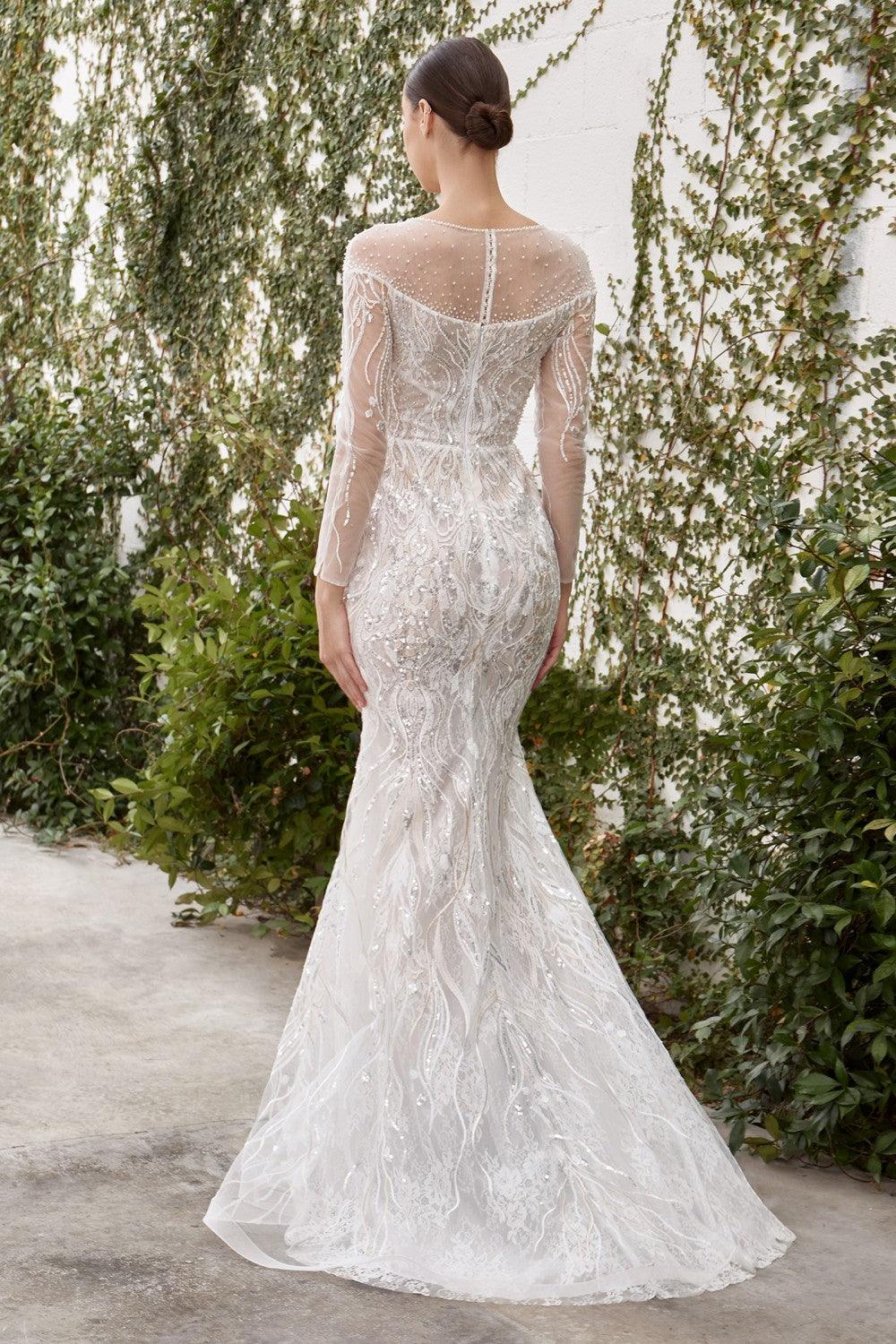 What better way to celebrate your big day than with a gorgeous long wedding dress? The silhouette of this bridal gown is perfect for the romantic bride. Featuring a fit and flare silhouette and glittering accents. The long sleeve bodice has a sweetheart crew neckline and a natural waist.