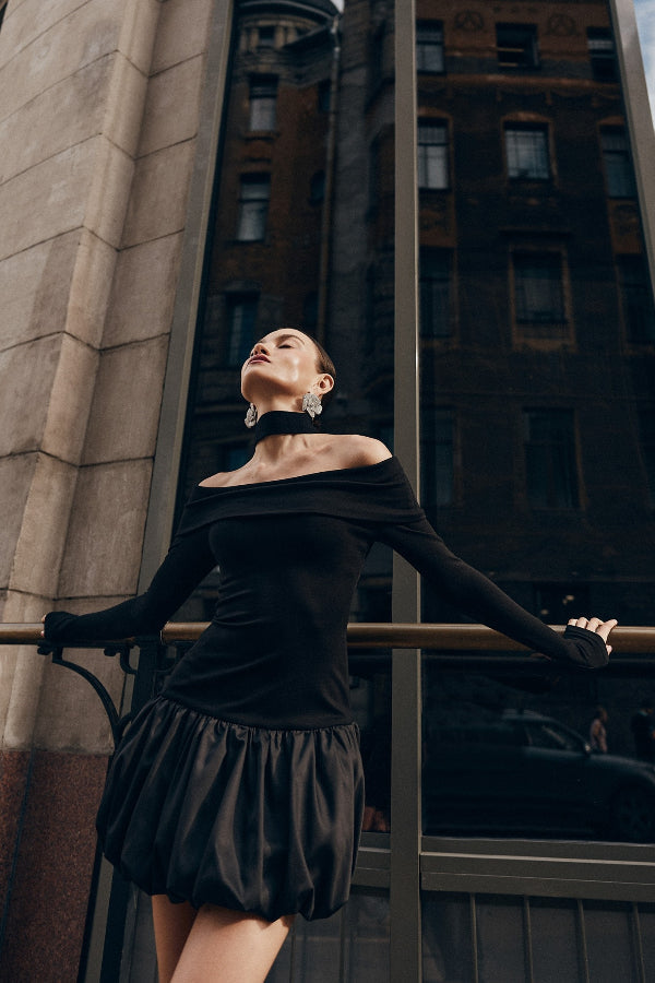 Playful mini dress made from a combination of two materials. The dress has an elasticated bodice with open shoulders and fitted long sleeves. and a voluminous balloon skirt.