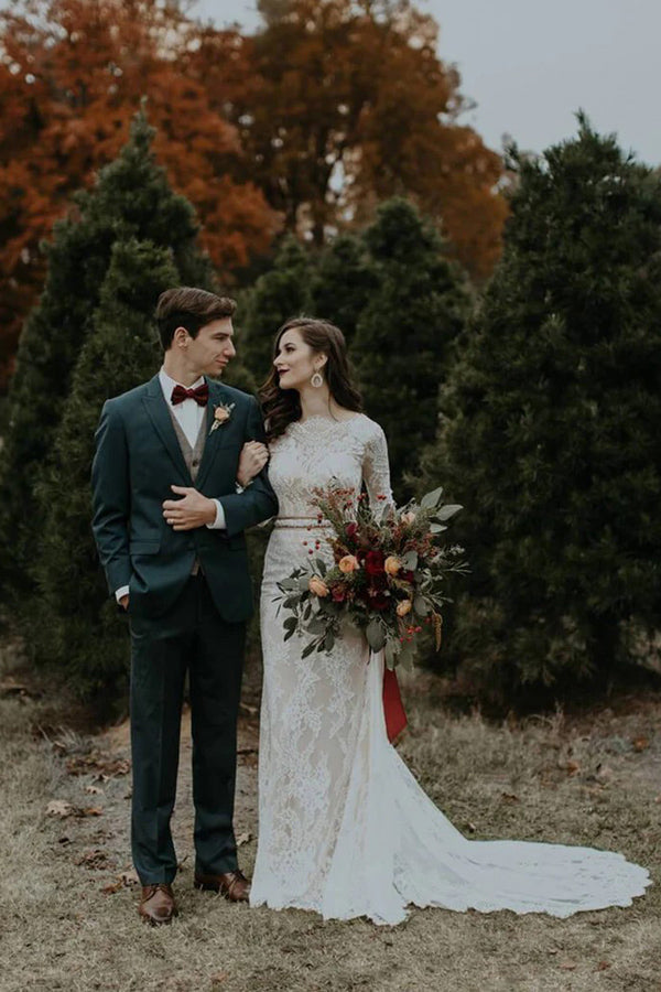 Long Sleeve Vintage Wedding Dress Backless Rustic Bridal Gown WD730