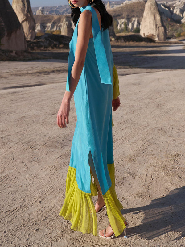 Loose Asymmetric Contrast Color Pleated Split-Joint Streamer One-Shoulder Evening Dresses Maxi Dresses