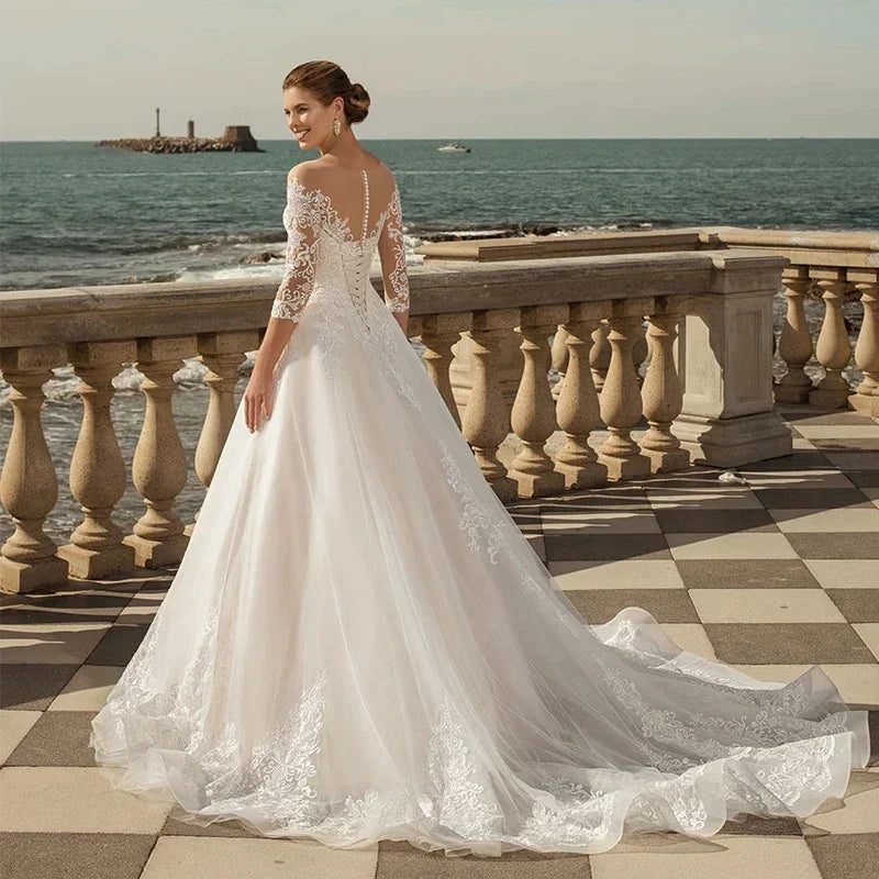 MACDUGAL Exquisite Three-Quarter Sleeves Mopping O-Neck Lace Charming Applique Back Lace Double Button Wedding Dress