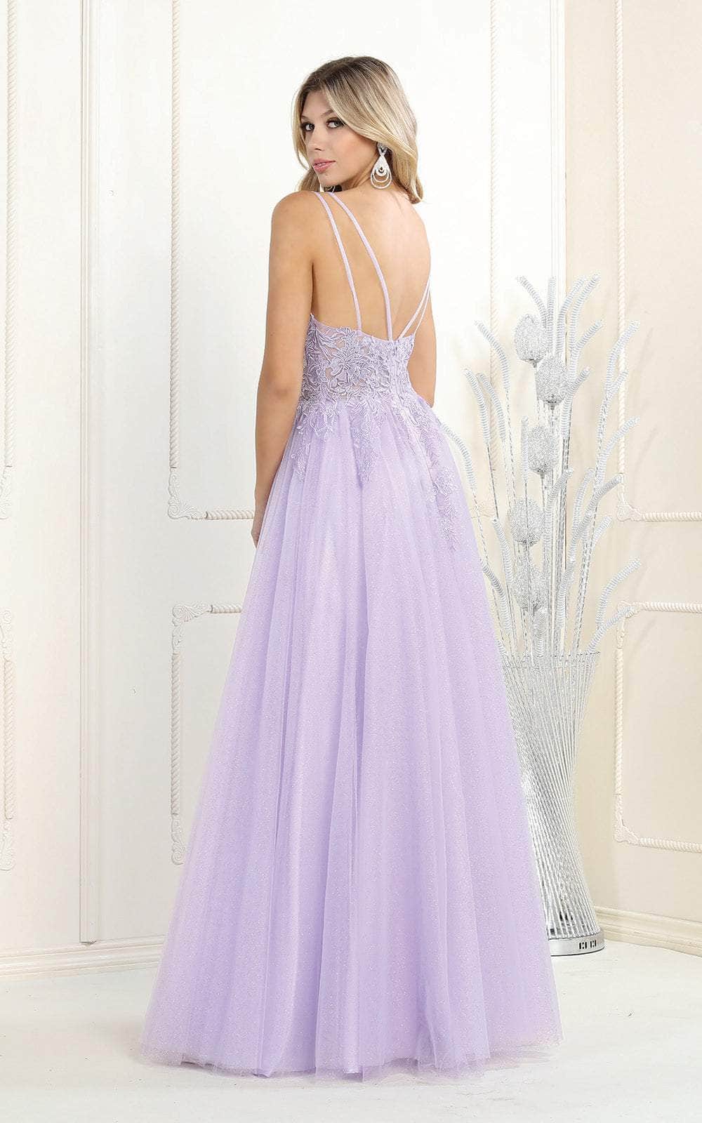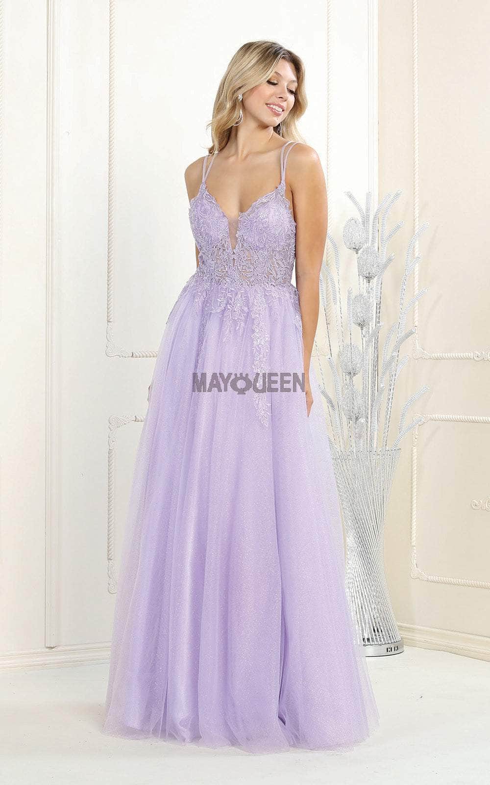 Make a memorable splash at your upscale evening in this lux formal A-line dress by May Queen. This glamorous dress features an illusion inset and dual spaghetti straps on the embroidered bodice that is also detailed with multicolored beads and is secured with a back zipper. The embroideries follow down below the waist area into the multilayered and glittery A-line skirt. Bring a touch of sunshine to your fancy-dress event in this creation by May Queen! Models are pictured wearing Dusty blue. Hunter green. Ivory and Lilac variants.