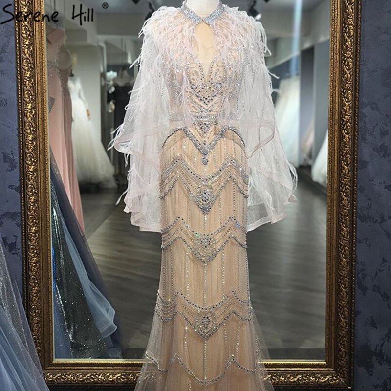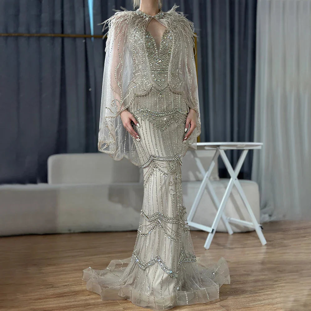 Nude Silver Mermaid V-Neck Sexy Evening Dresses 2025 Sleeveless Feathers Shawl Yarn Diamond Formal Dress LA70171B