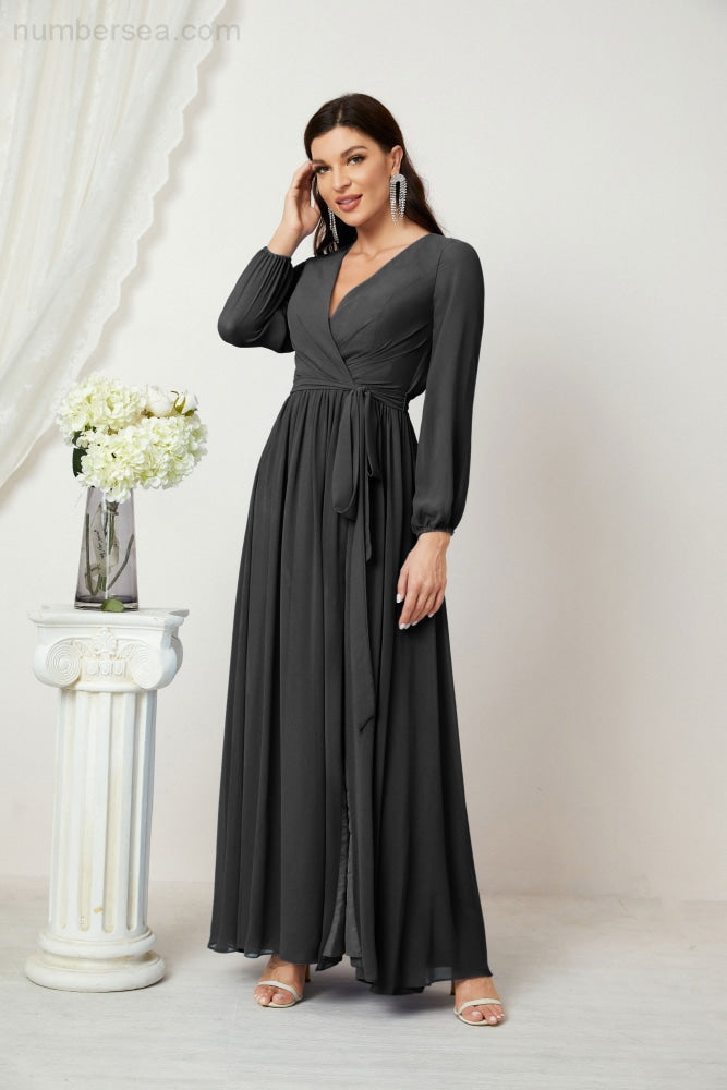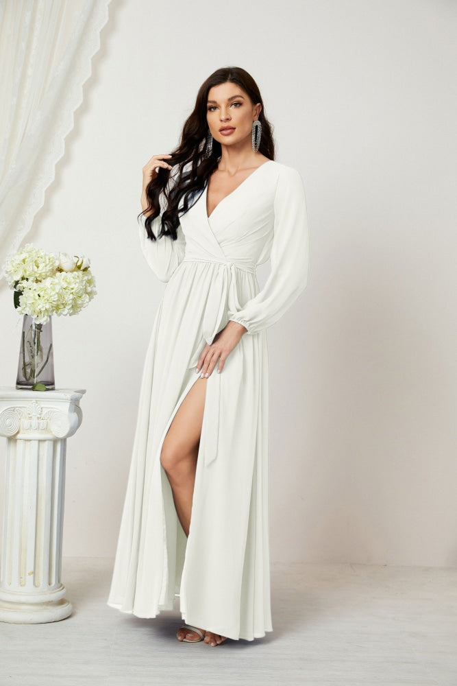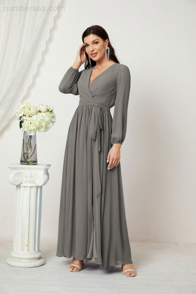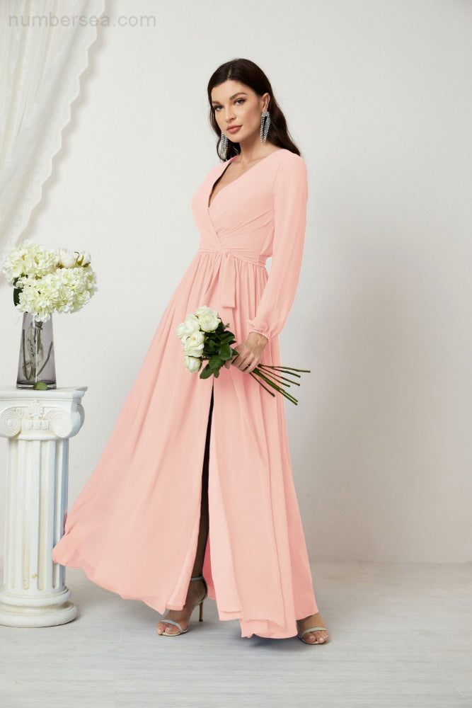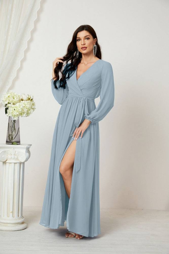 Sunnderly Evening Dresses Deep V-Neck Chiffon Bridesmaid Dresses Long Bishop Sleeve Side Split Formal Dress SY2806