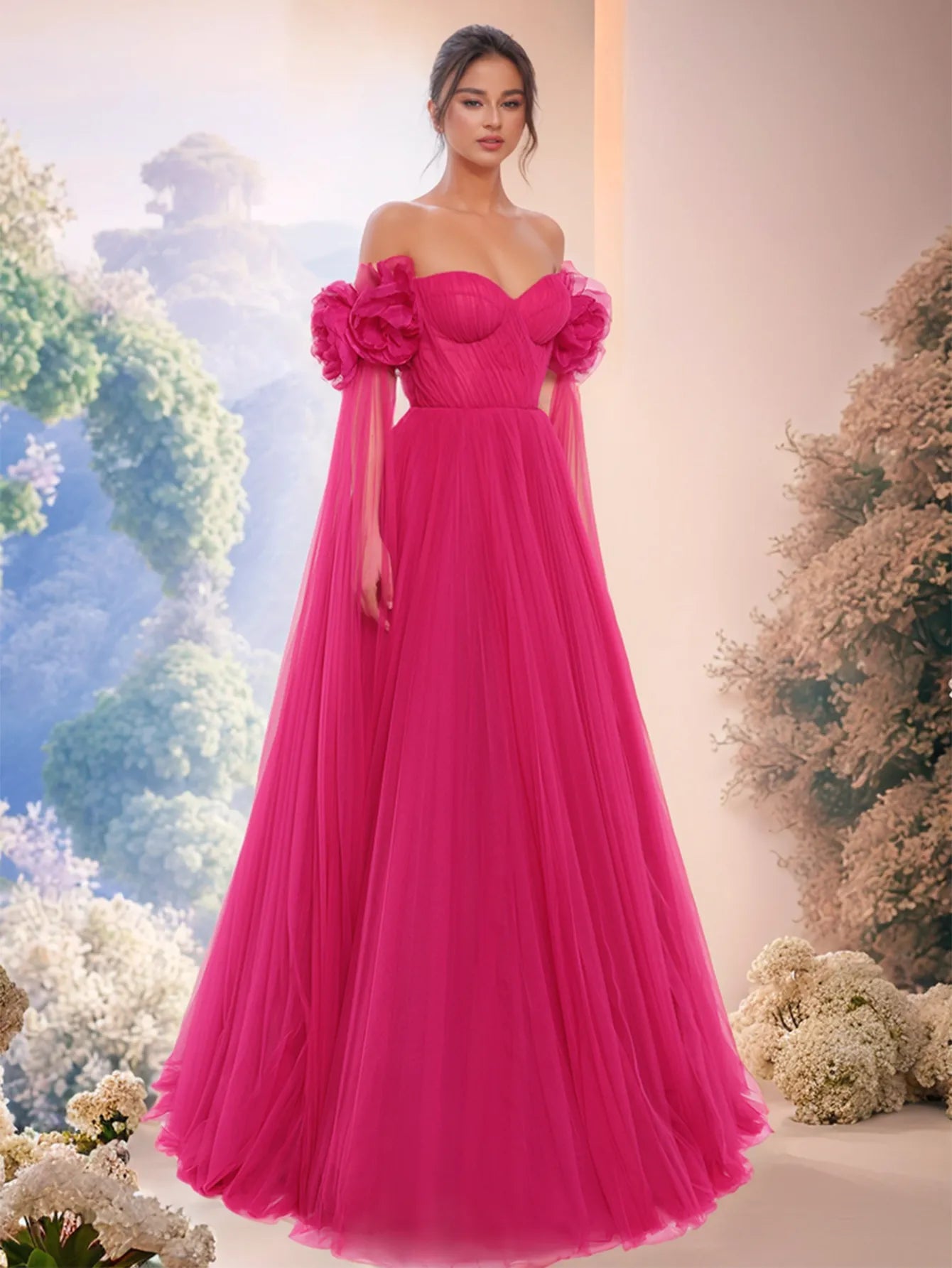 Off Shoulder 3D Rose Ball Gown Evening Dress with Long Sleeve