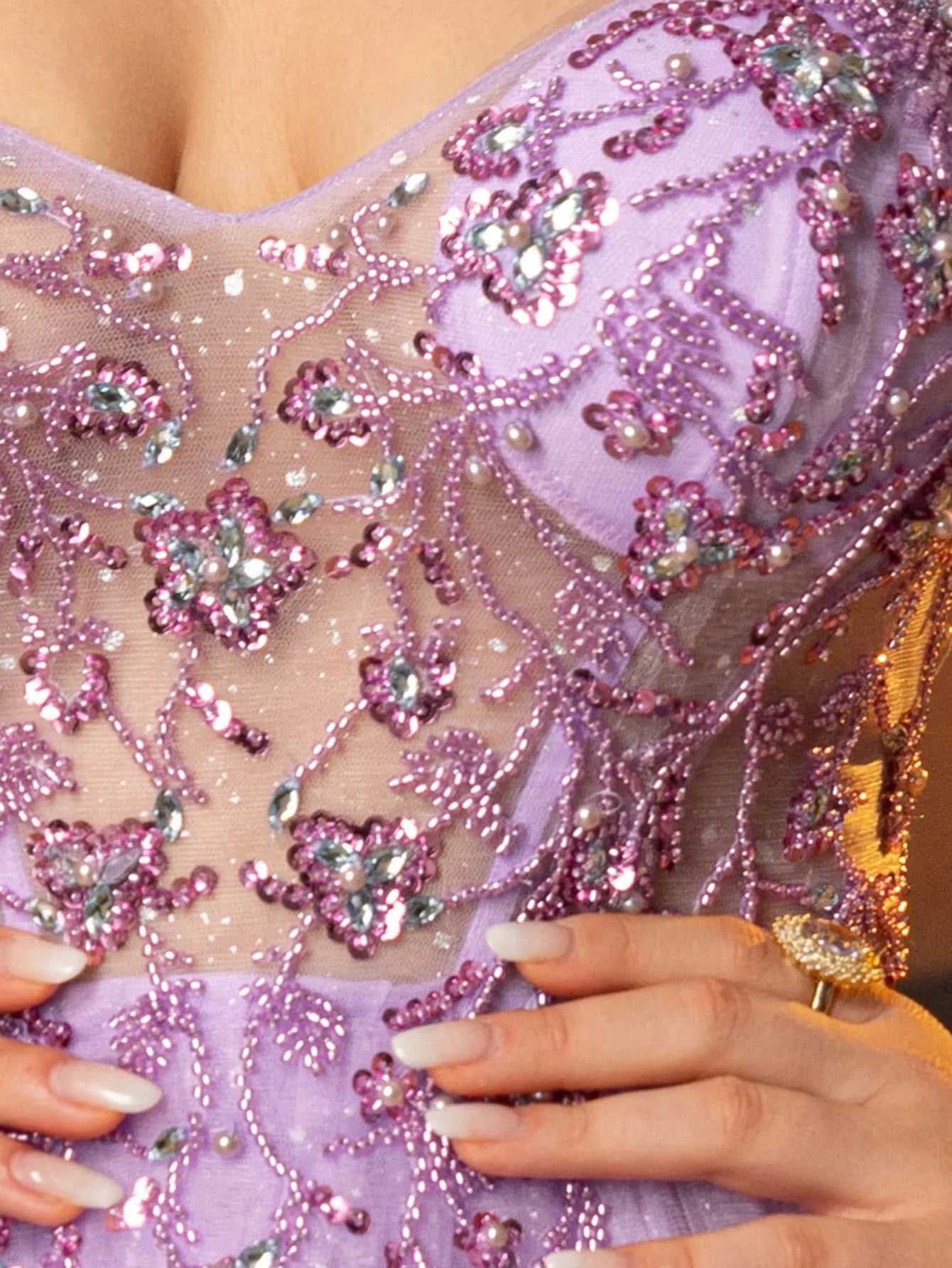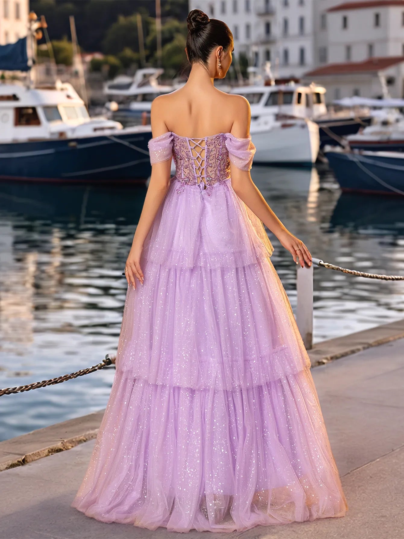 Off Shoulder Sparkly Lace Embroidery Layered Ball Gown Prom Dress