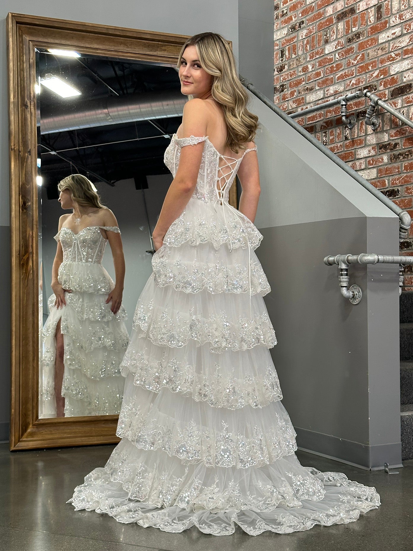 A Line Off the Shoulder Corset Prom Dress with Lace Ruffles