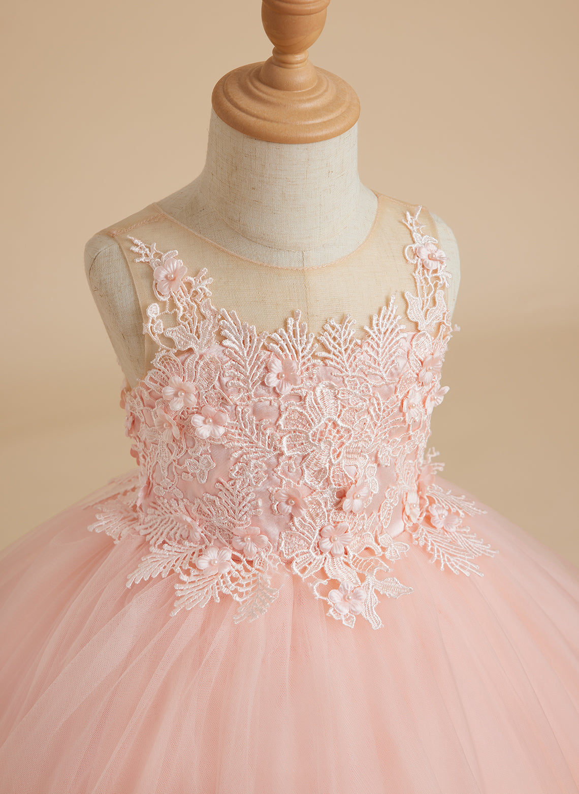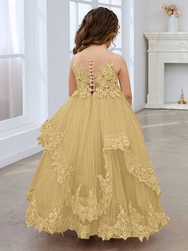 Princess Sleeveless Tulle Gown with Lace Appliques and Sweep Train for Girls