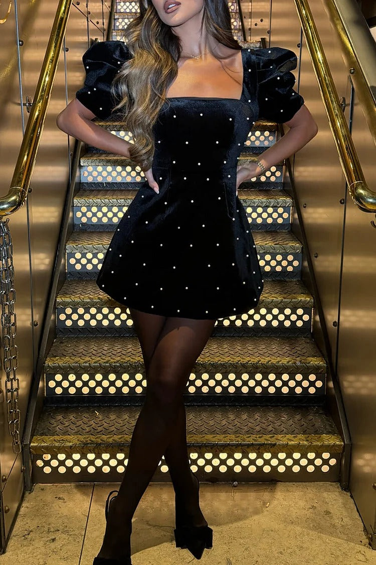 - Black velvet dress with pearl detailing - Cinched waist - Puff sleeves - Invisible zip