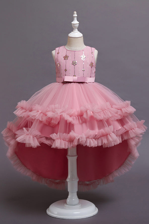 Red High Low Belt Tulle Ruffles Flower Girl Dresses