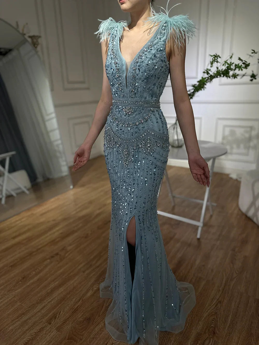 2025 Arabic Blue Elegant Split Mermaid Beaded Feathers Long Evening Dresses Gowns for Formal Occasion LA72742