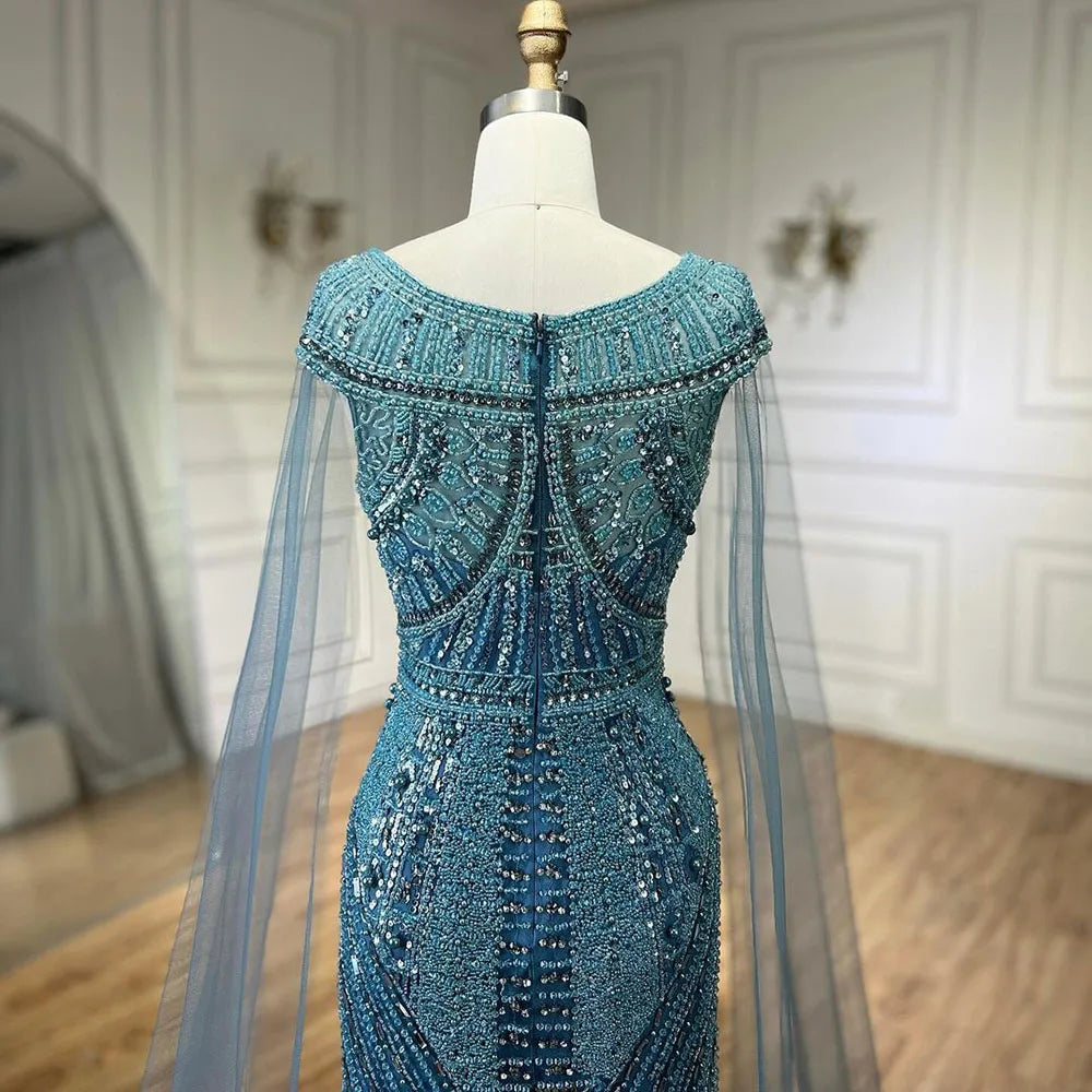 2025 Arabic Blue Mermaid Elegant Cape Sleeves Beaded Luxury Evening Dresses Gowns for Women Wedding Party LA72423