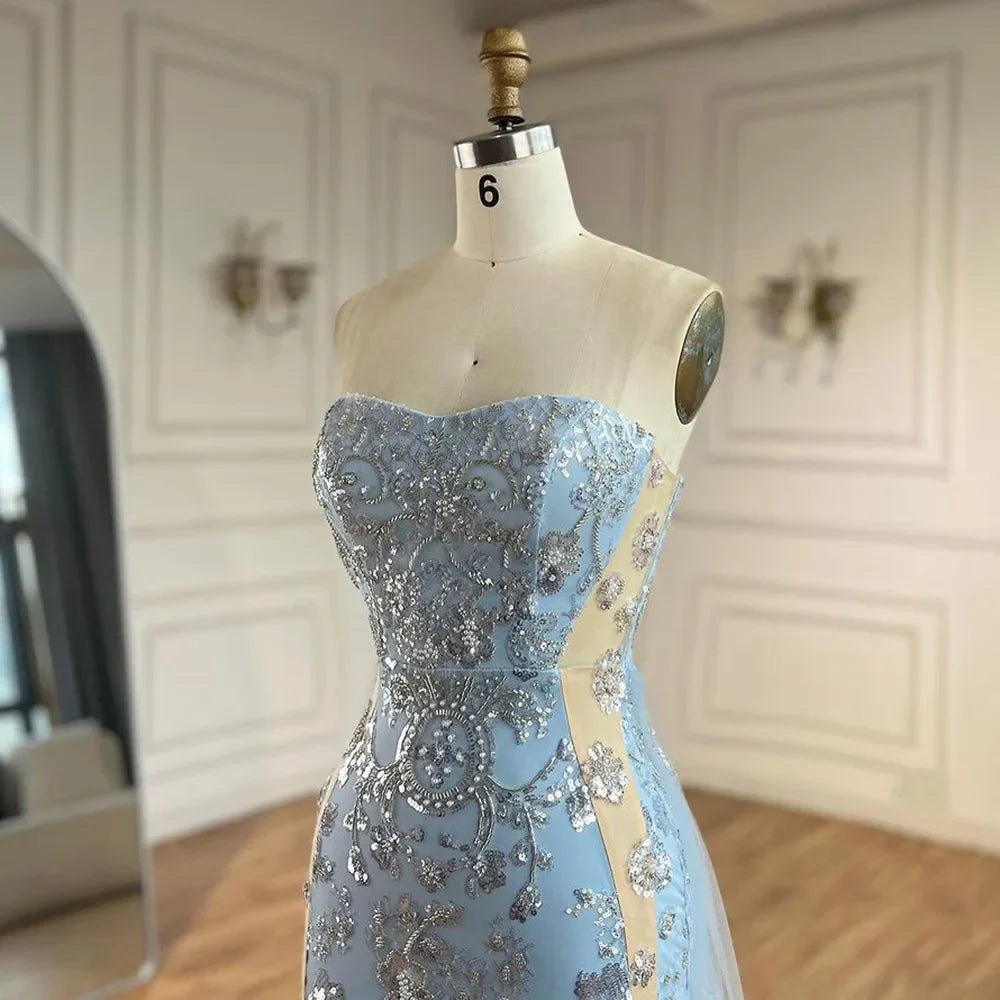 2025 Arabic Blue Strapless Mermaid Luxury Evening Gown with Tulle Overskirt Beaded Dress for Women's Party LA72639