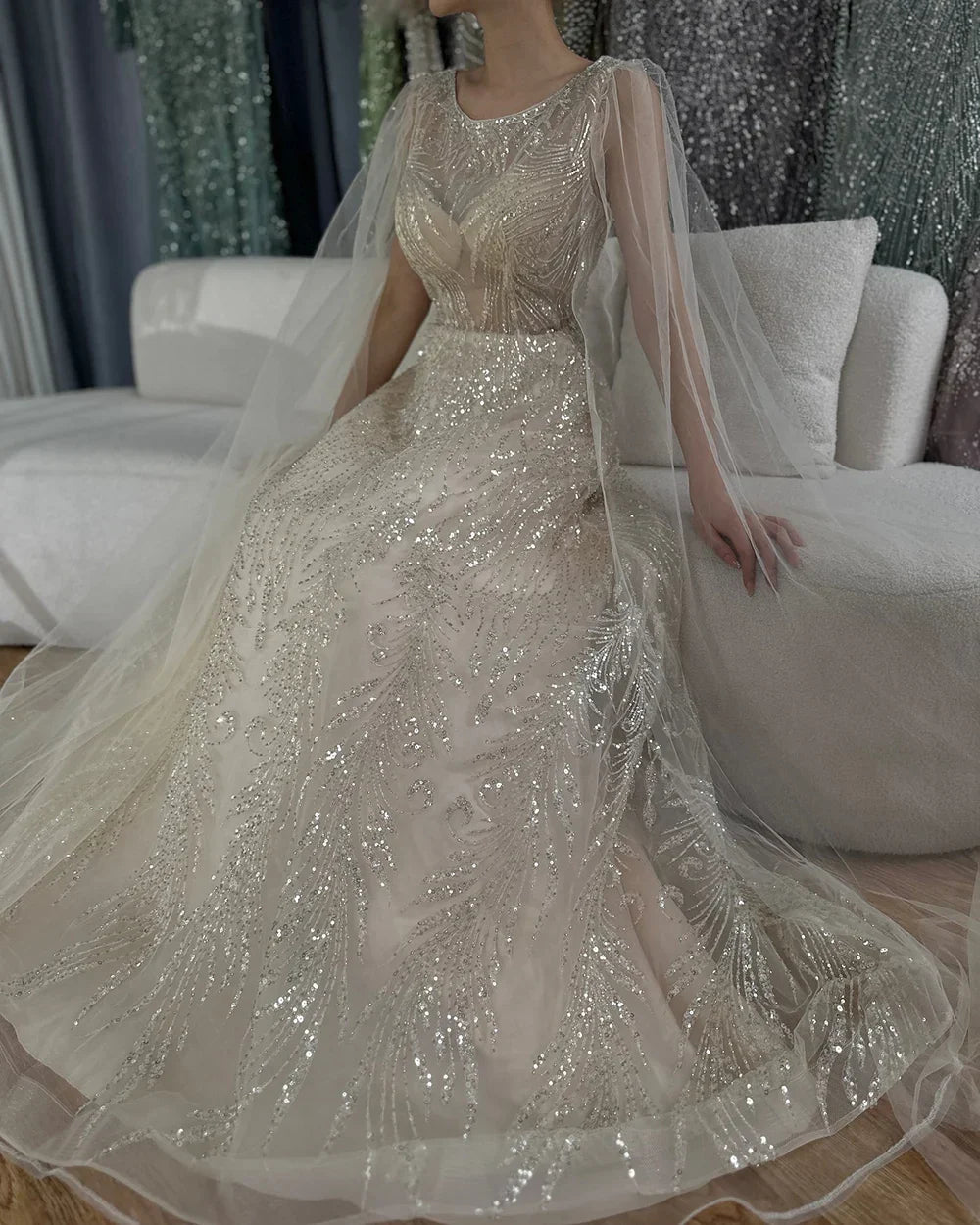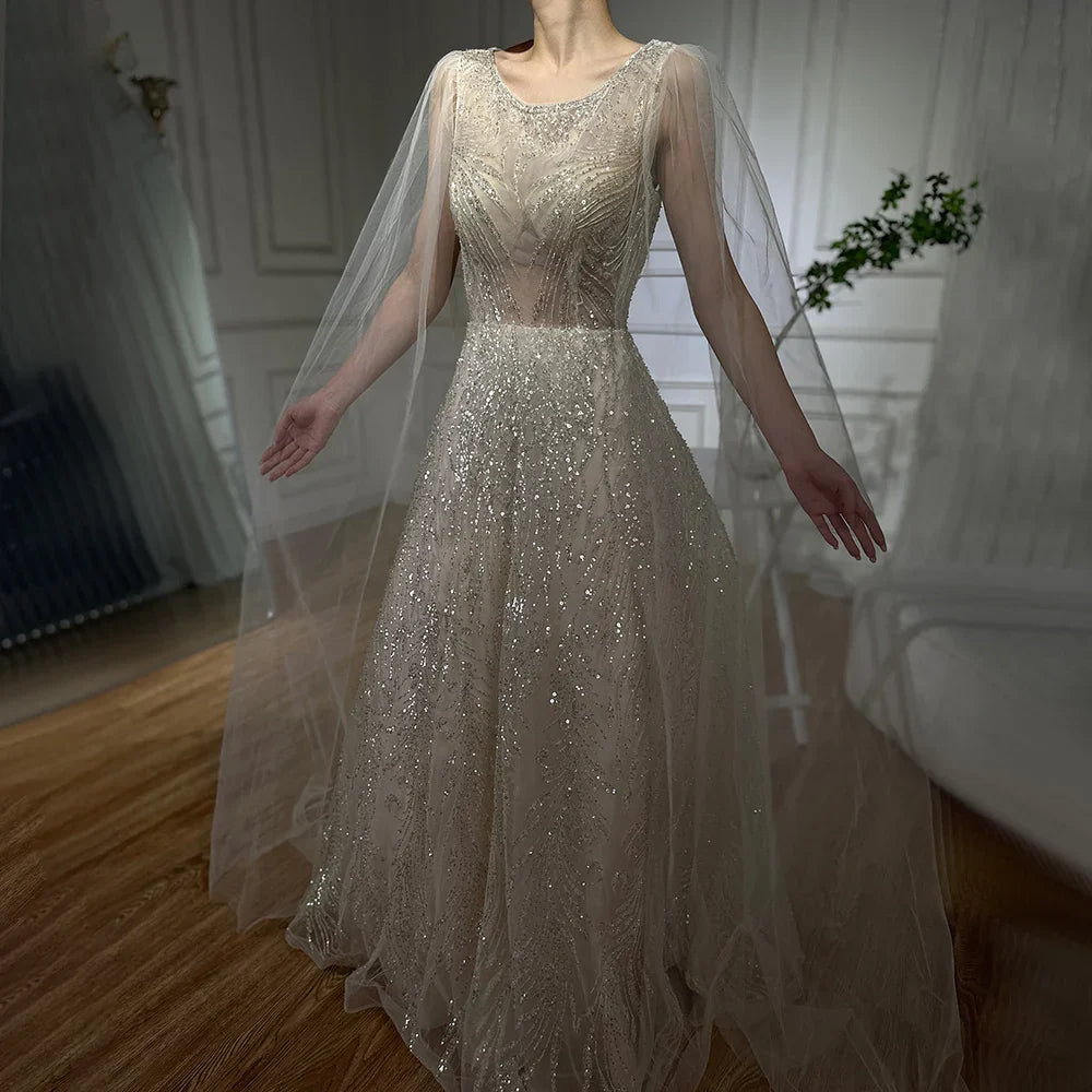 2025 Arabic Lilac Elegant A-Line Beaded Long Evening Dresses Gowns with Cape Sleeves for Formal Occasion LA72744
