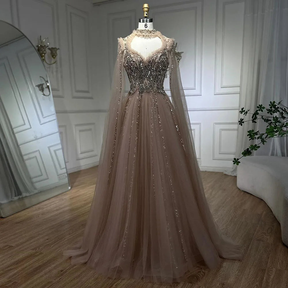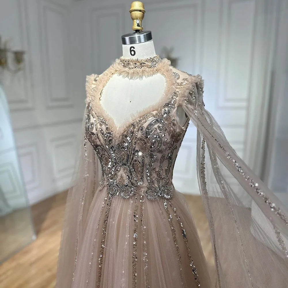 2025 Arabic Nude A Line Elegant Cape Sleeves Beaded Luxury Evening Dresses Gowns for Women Wedding Party LA72384
