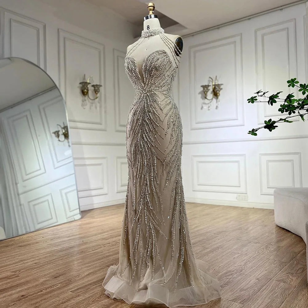 2025 Arabic Nude Halter Neck Mermaid Pearls Beaded Luxury Dubai Evening Gown for Women's Party LA72696