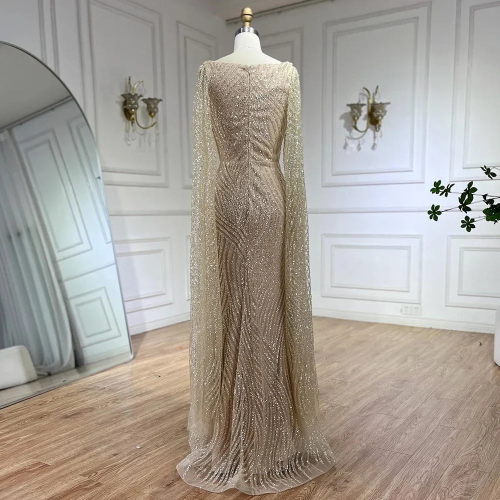 2025 Arabic Nude Mermaid Elegant Cape Sleeves Beaded Luxury Evening Dresses Gowns for Women Wedding Party LA72320